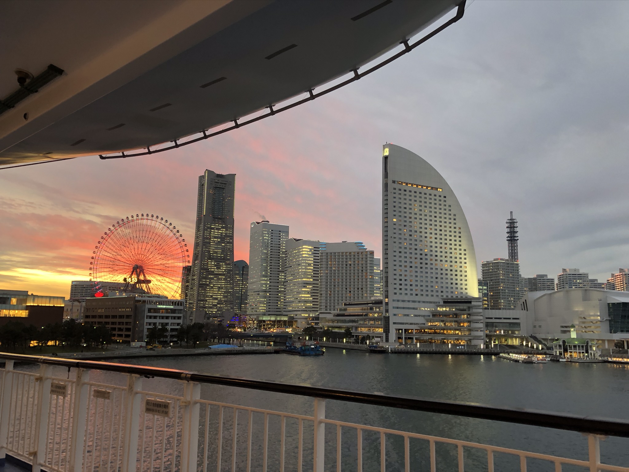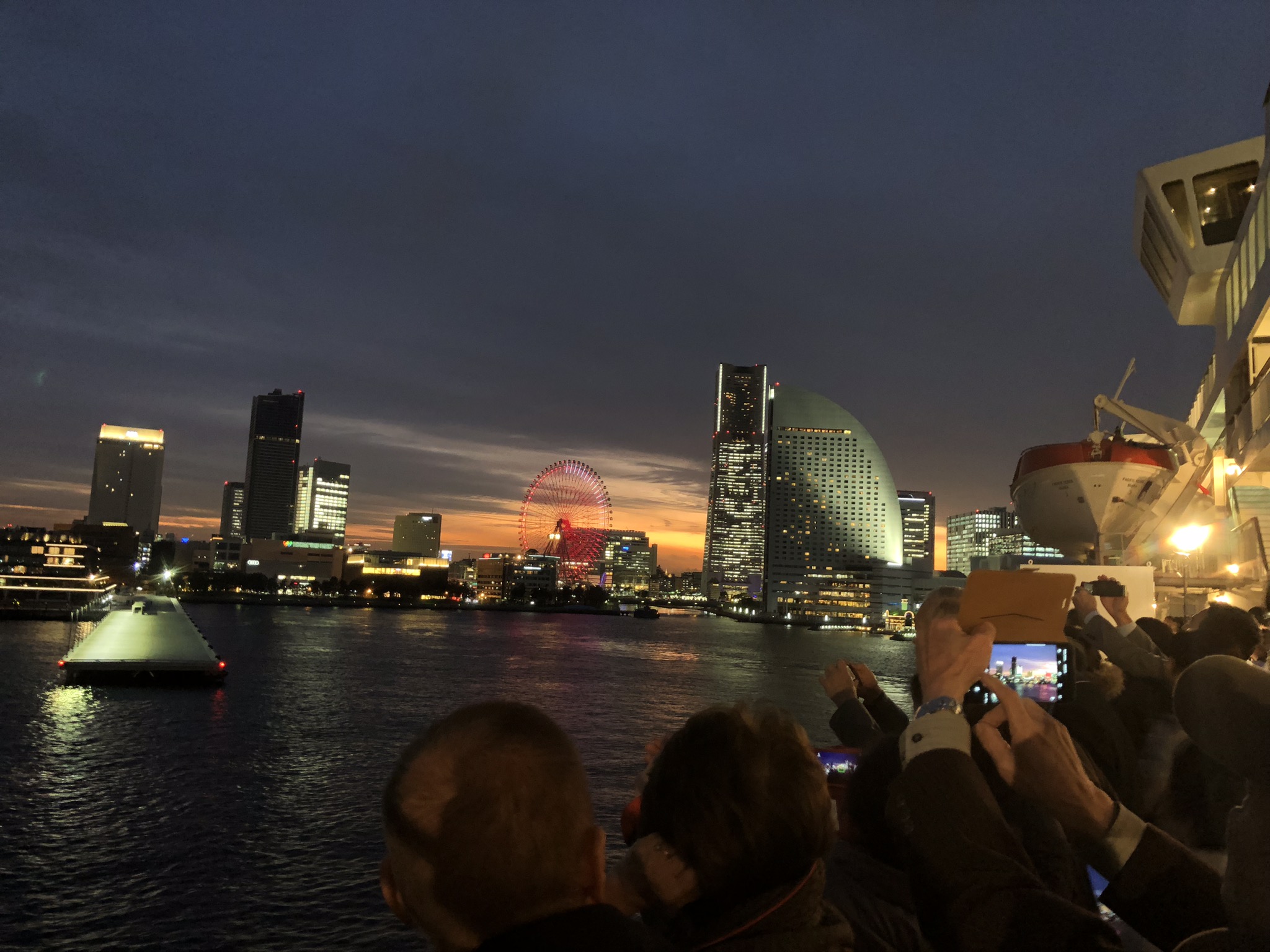 黄昏ていく、横浜みなとみらいを眺めながらの出航はロマンチックです。