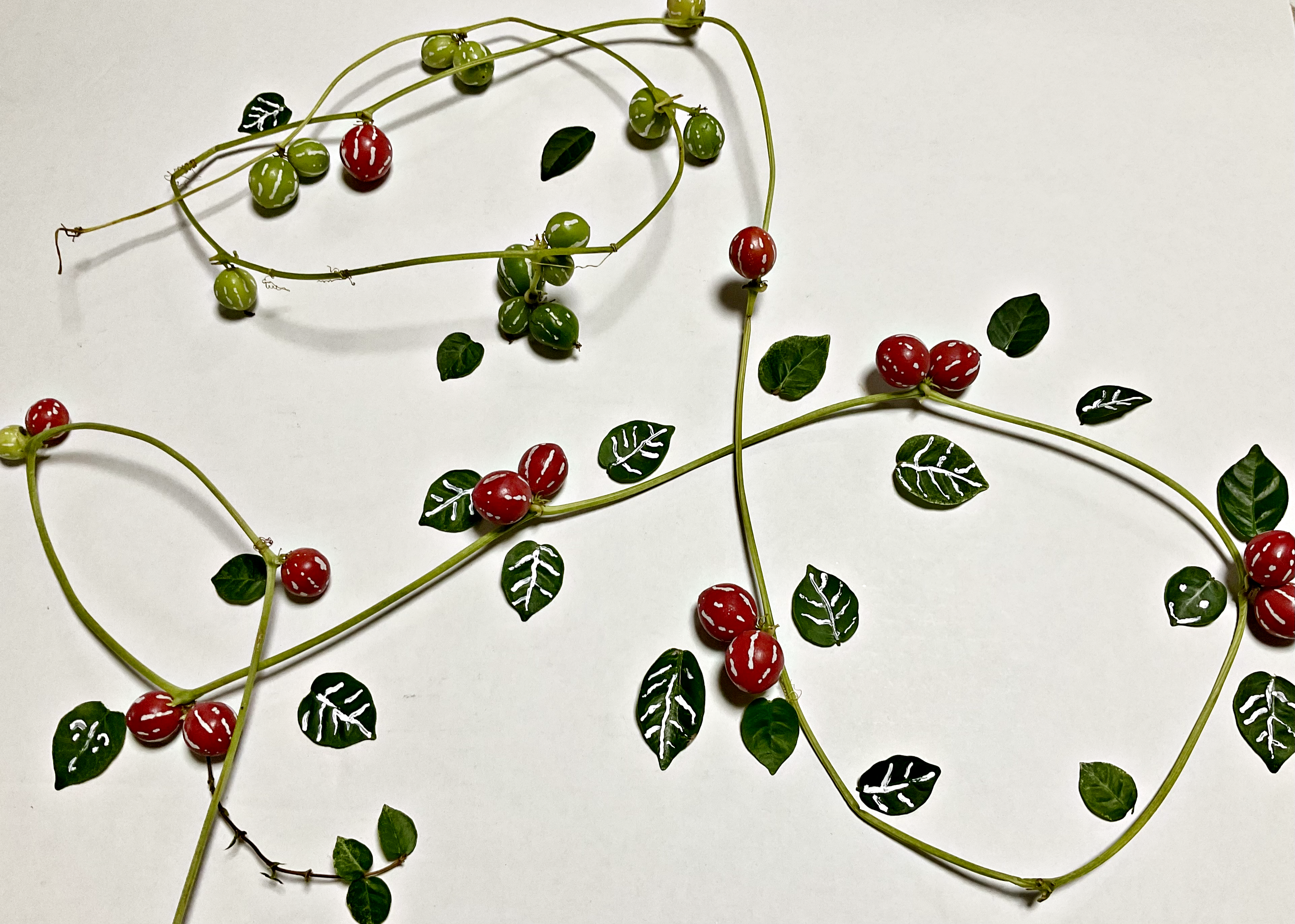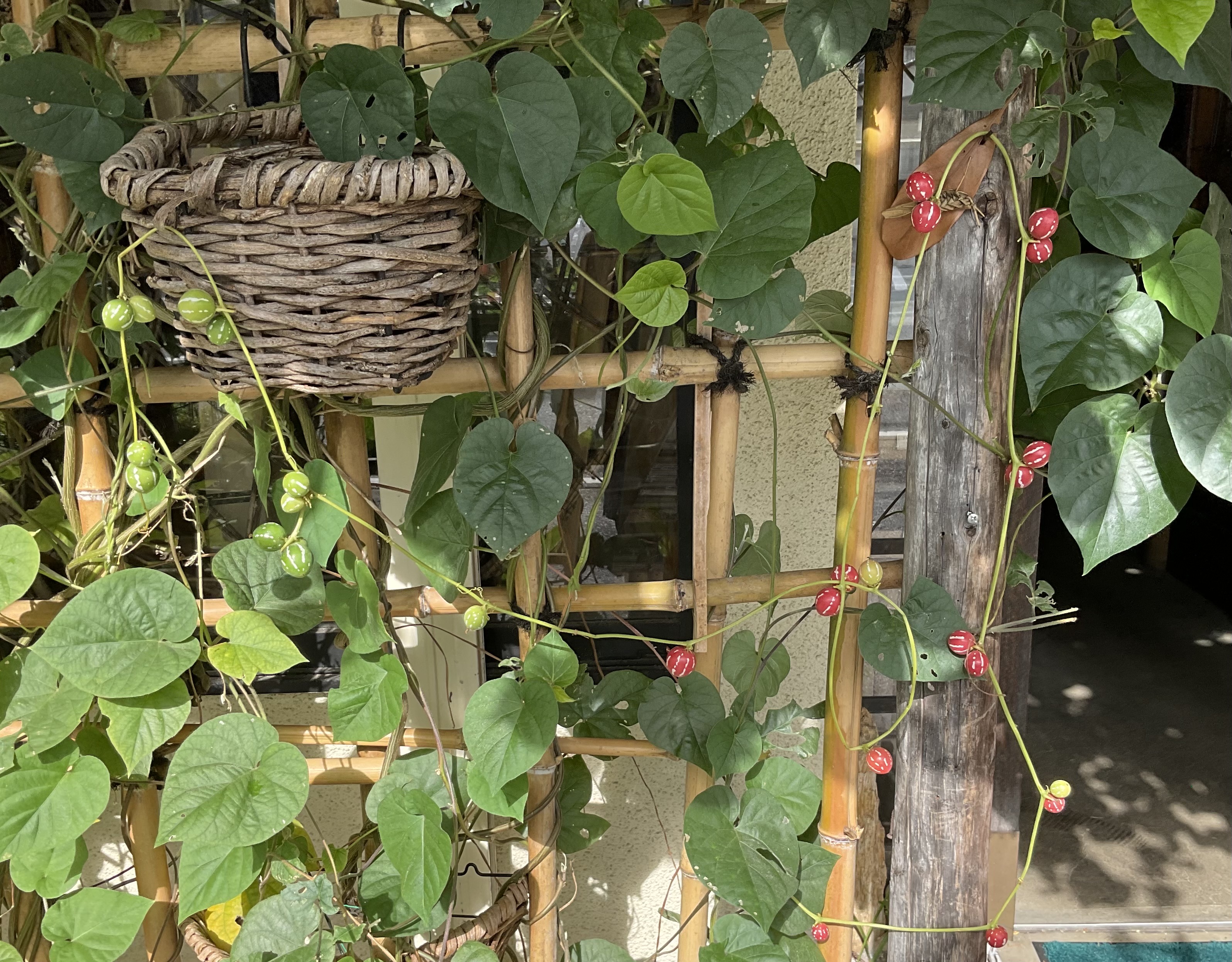 店のシャッター開けたら可愛い首飾りが垣根にぶら下がっていた。